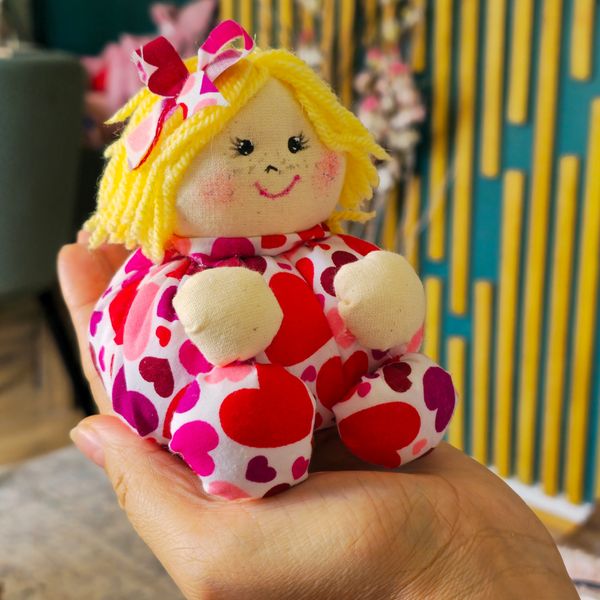 Spread a little extra kindness with Love Mimimi! This handcrafted rag doll is all about big smiles and even bigger hearts. With her bright yellow yarn hair, signature pink bow, and a dress covered in vibrant hearts, she’s the perfect companion for anyone who needs a reminder that they are loved.